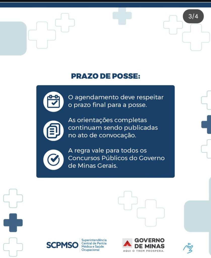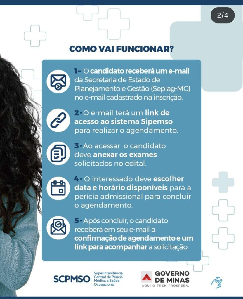 O candidato receberá, no e-mail cadastrado no ato da inscrição, uma mensagem da Secretaria de Estado de Planejamento e Gestão (Seplag-MG) contendo o link de acesso ao sistema Sipemso. Para formalizar o agendamento da perícia admissional, é imprescindível realizar o upload dos exames exigidos em edital e selecionar uma data e horário disponíveis para realização da perícia admissional. Após a finalização do procedimento, será enviado um e-mail de confirmação acompanhado do link para acompanhamento da solicitação. Ressalta-se que o agendamento deve observar o prazo limite para a posse, e as orientações completas continuam sendo publicadas nos atos de convocação.
