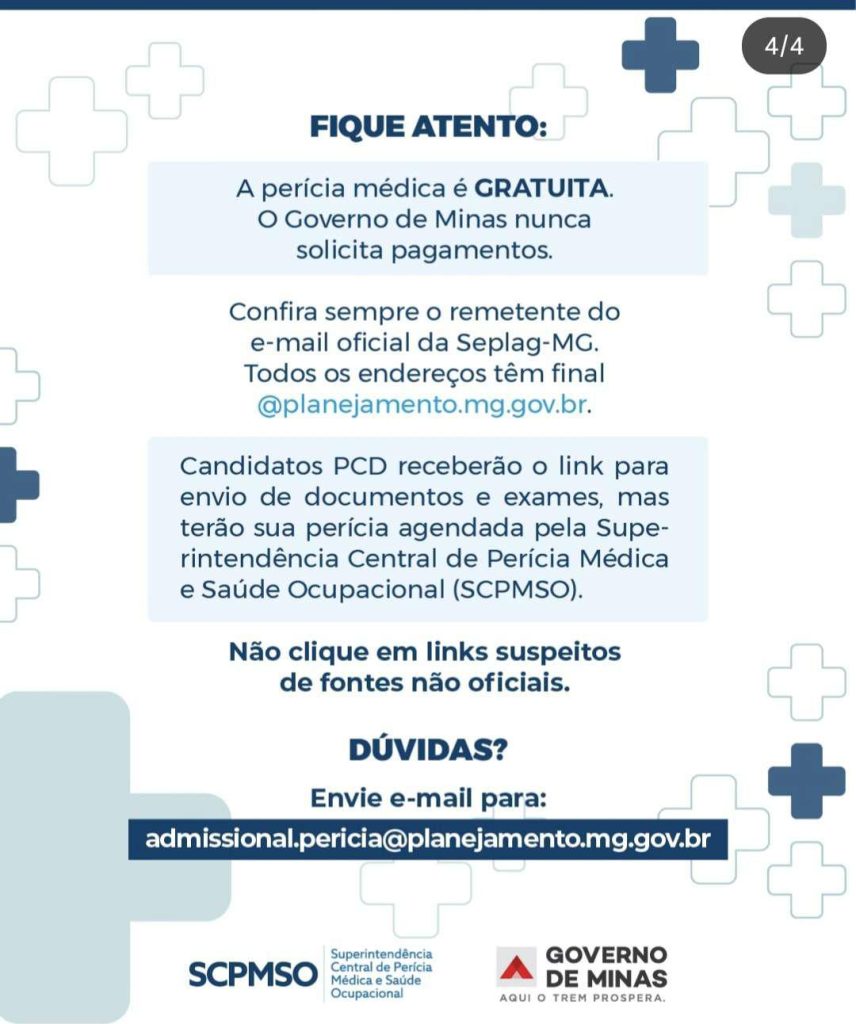 Atenção: A perícia médica é integralmente GRATUITА. O Governo de Minas Gerais não solicita pagamentos de qualquer natureza. Verifique sempre a autenticidade do remetente; os e-mails oficiais da Seplag-MG possuem o domínio @planejamento.mg.gov.br. Evite interagir com links suspeitos de fontes não oficiais.